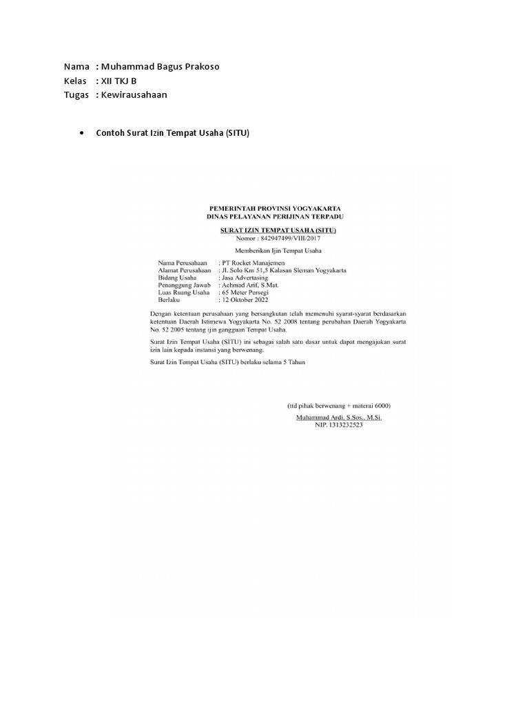 Sebagai contoh yang bisa kamu perlukan adalah izin gangguan di wilayah ende, nusa tenggara timur. Surat izin tempat usaha (situ)/izin gangguan (ho); Surat izin gangguan atau yang biasa disebut ho (hinderordonnantie) adalah surat keterangan yang menyatakan tidak adanya keberatan dan gangguan atas lokasi usaha yang dijalankan oleh suatu kegiatan usaha di suatu tempat.