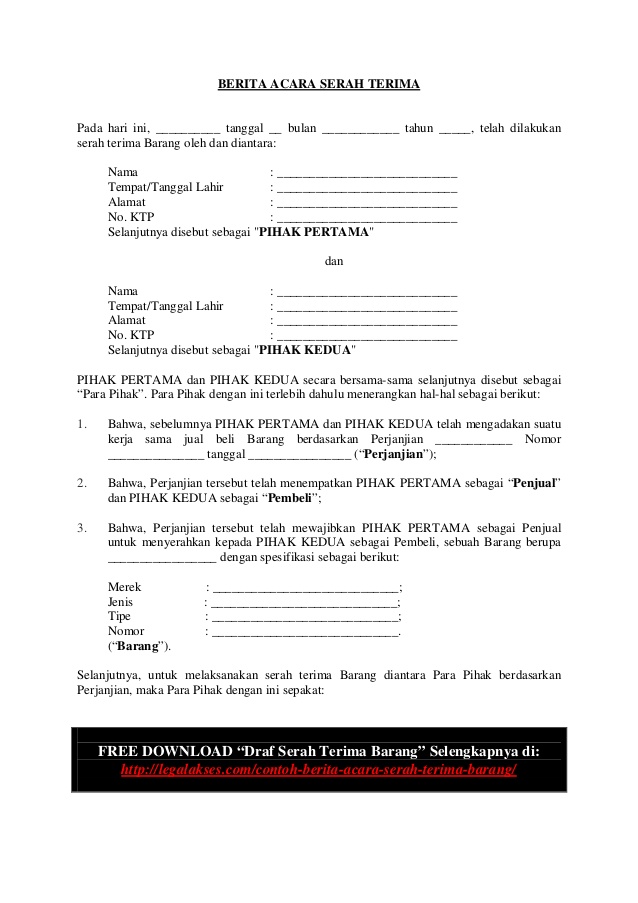 Sementara itu, proses serah terima pekerjaan secara umum juga sangat. Berita acara merupakan salah satu dokumen penting dalam sebuah kegiatan diperusahaan, misalnya saat melakukan tanda tangan persetujuan kerjasama, melakukan sebuah perjanjian bisnis, melakukan mergerisasi perusahaan, pengadaan barang atau inventaris kantor. Banyak contoh surat resign yang bisa kamu teladani.