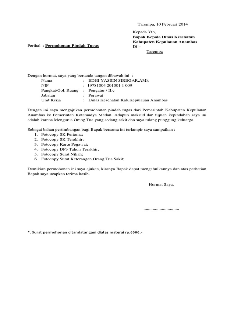 Contoh Surat Permohonan Pindah Tugas Pns.