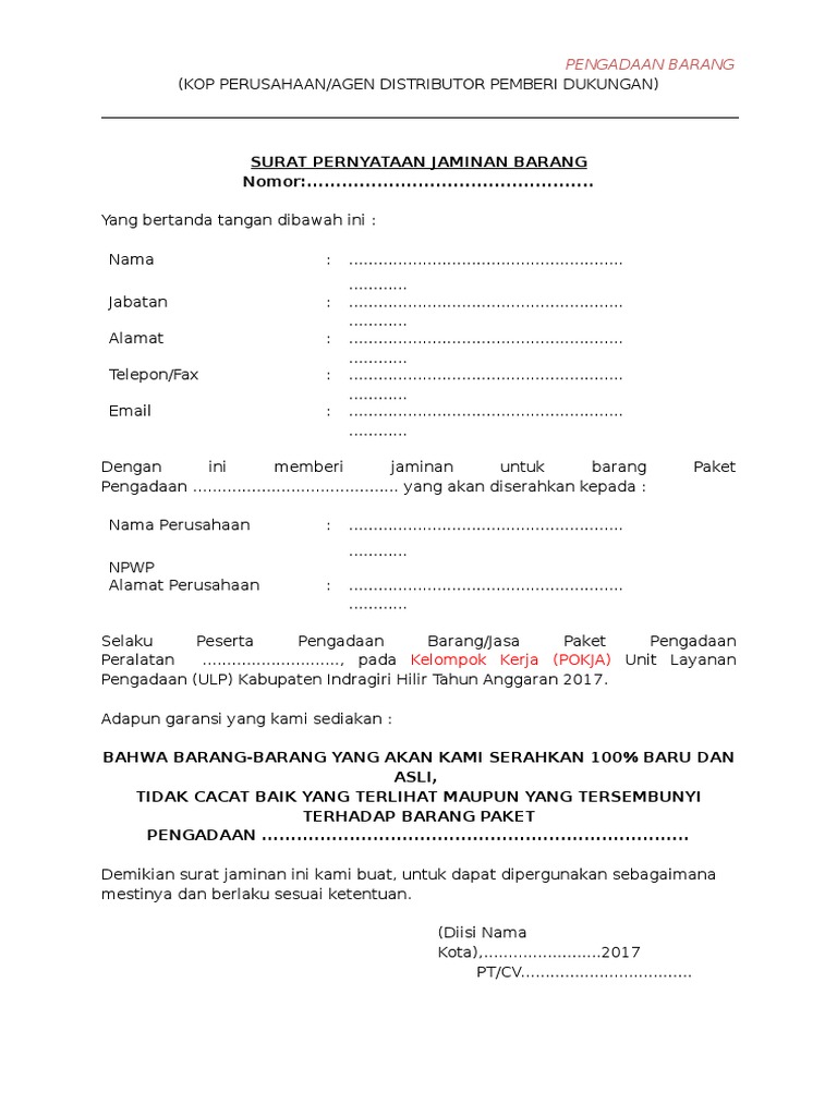 Contoh surat pernyataan supplier have an image from the other. Contoh surat dukungan bank untuk lelang. Pada proses pengadaan barang dan jasa paket pekerjaan pengadaan mesin/peralatan kami dengan ini memberikan garansi dan jaminan secara penuh untuk barang yang ditawarkan oleh perusahaan untuk dipasok oleh pemasok barang tersebut diatas sesuai dengan ketentuan dalam dokumen lelang.